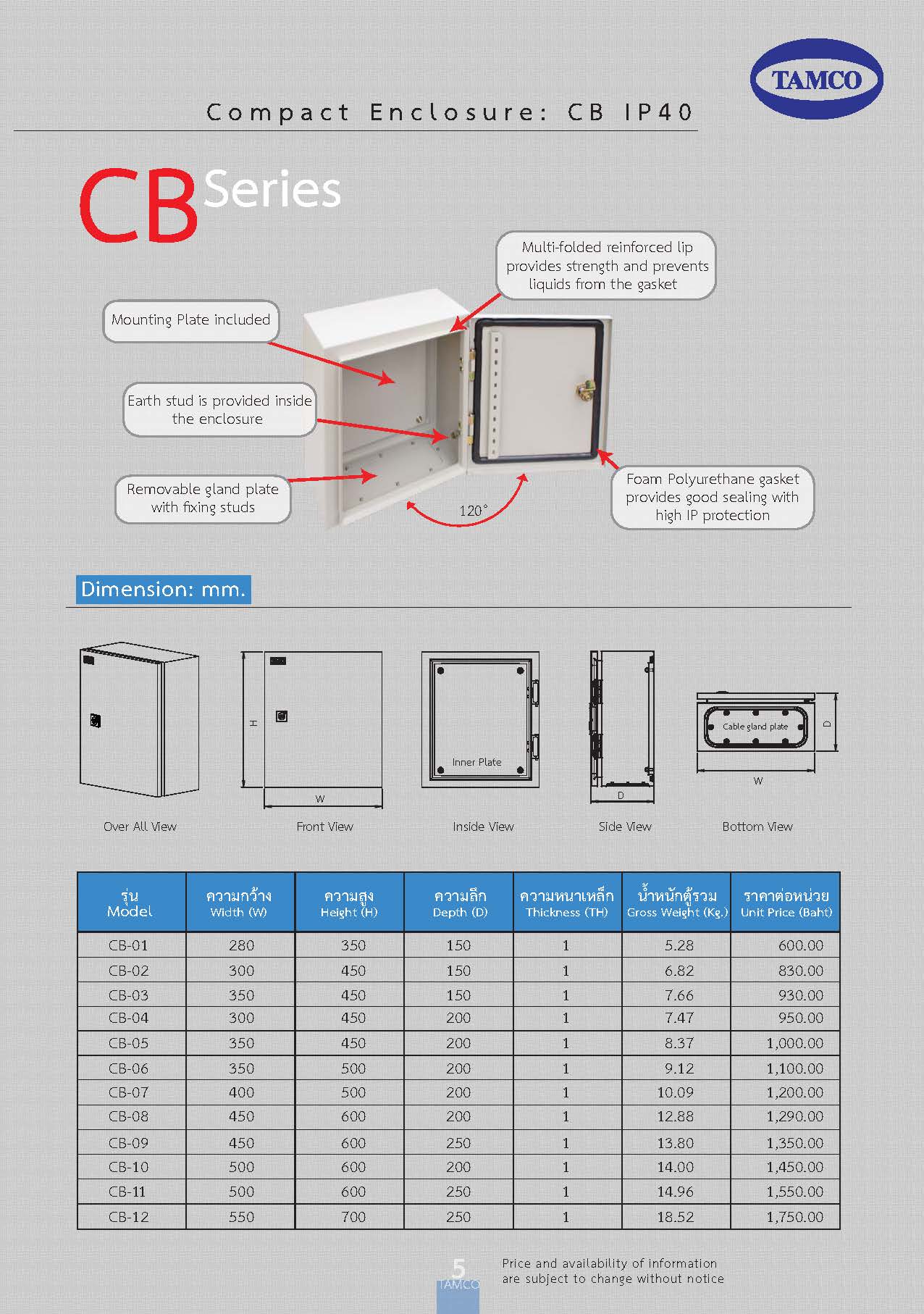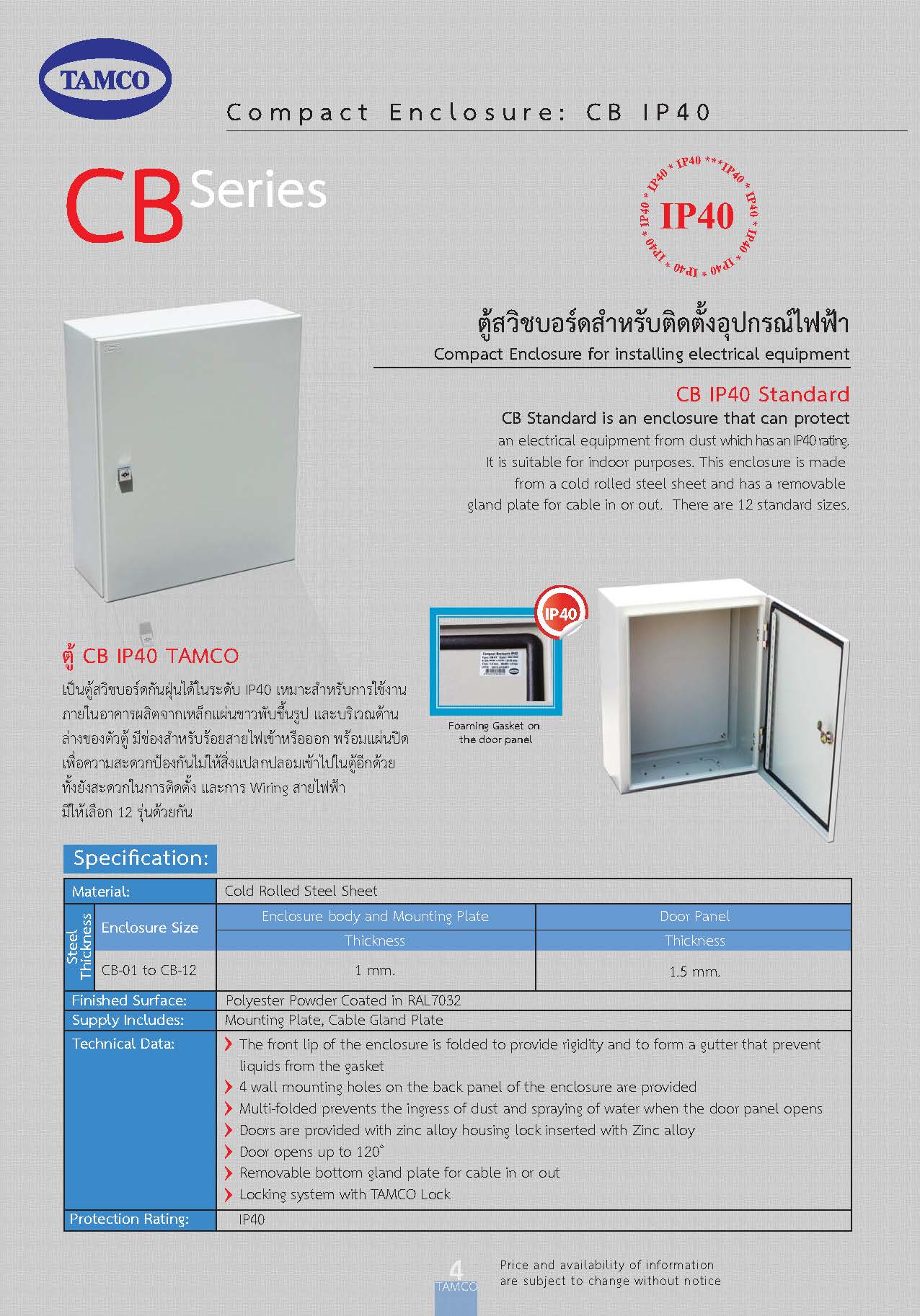 ตู้ CB IP55 TAMCO ยี่ห้อ : TAMCO รุ่น : CB ตู้ CB IP 55 TAMCO เป็นตู้สวิชบอร์ดกันฝุ่นและกันละอองน้ำได้ เหมาะสำหรับการใช้งานภายในอาคารและภายนอกอาคาร ผลิตจากเหล็กแผ่นขาวพับขึ้นรูป แ...