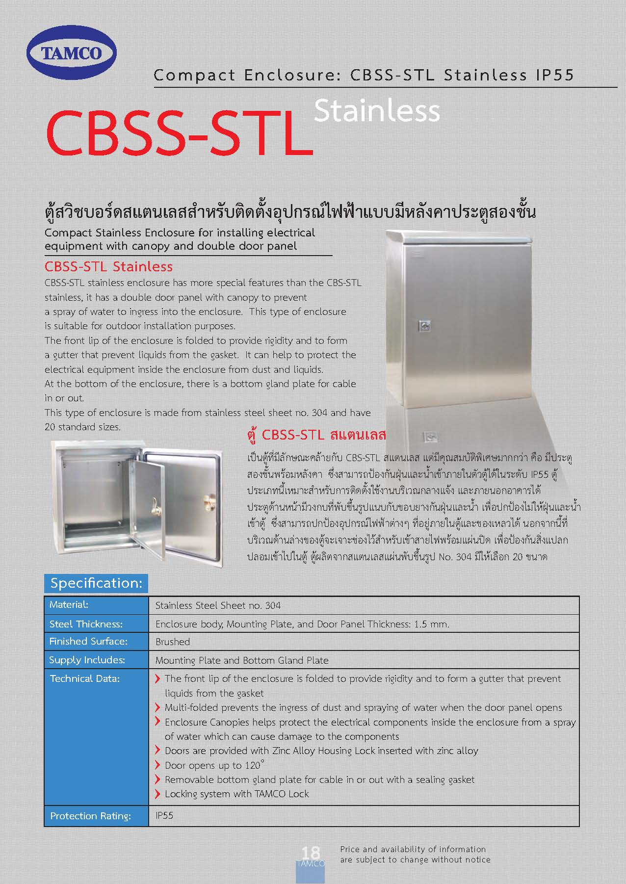 ตู้ CBSS-STL สแตนเลส IP55 TAMCO ยี่ห้อ : TAMCO รุ่น : CBSS-STL สแตนเลส ตู้ CBSS-STL สแตนเลส IP 55 TAMCO ตู้สวิชบอร์ดสแตนเลสสำหรับติดตั้งอุปกรณ์ไฟฟ้าแบบมีหลังคาประตูสองชั้น เป็นตู้ที่มีลักษณะคล้ายกับ CBS-STL สแตนเลส แต่มีคุณสมบัติพิเศษมากกว่า คือ มีประตูสองชั้นพร้อมหลังคา ซึ่งสามารถป้องกันฝุ่นและน้ำเข้าภายในตัวตู้ได้ในระดับ IP55 ตู้ประเภทนี้เหมาะสำหรับการติดตั้งใช้งานบริเวณกลางแจ้ง และภายนอกอาคารได้ ประตูด้านหน้ามีวงกบที่พับขึ้นรูปแนบกับขอบยางกันฝุ่นและน้ำ เพื่อป้องกันไม่ให้ฝุ่นและน้ำเข้าตุ้ ซึ่งสามารถปกป้องอุปกรณ์ไฟฟ้าต่างๆ ที่อยู่ภายในตู้และของเหลวได้ นอกจากนี้ที่บรเวณด้านล่างของตู้จะเจาะช่องไว้สำหรับเข้าสายไฟพร้อมแผ่นปิด เพื่อป้องกันสิ่งแปลกปลอมเข้าไปในตู้ ตู้ผลิตจากสแตนเลสแผ่นพับขึ้นรูป No. 304 มีให้เลือก 20 ขนาด |
