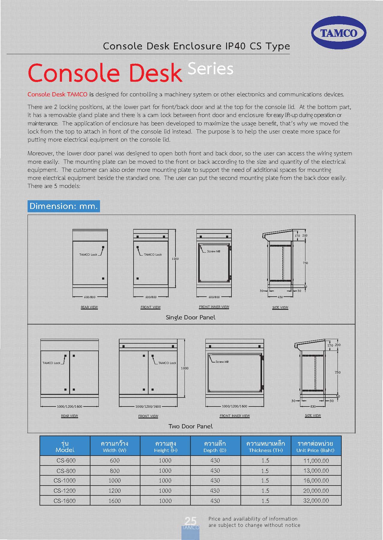 ตู้ Console Desk มีระบบล็อค 2 ตำแหน่ง ทั้งตู้ส่วนล่างและส่วนเฉียงด้านบนเพื่อให้ตู้สามารถปิดได้สนิท เจาะช่องเข้าสายพร้อมแผ่นปิดไว้ที่ด้านล่างของตัวตู้  ที่ฝาปิดส่วนเฉียงจะติดแคล้มยึดไว้กับตัวตู้ เพื่อสะดวกในการยกเปิดขณะทำงานหรือซ่อมบำรุง