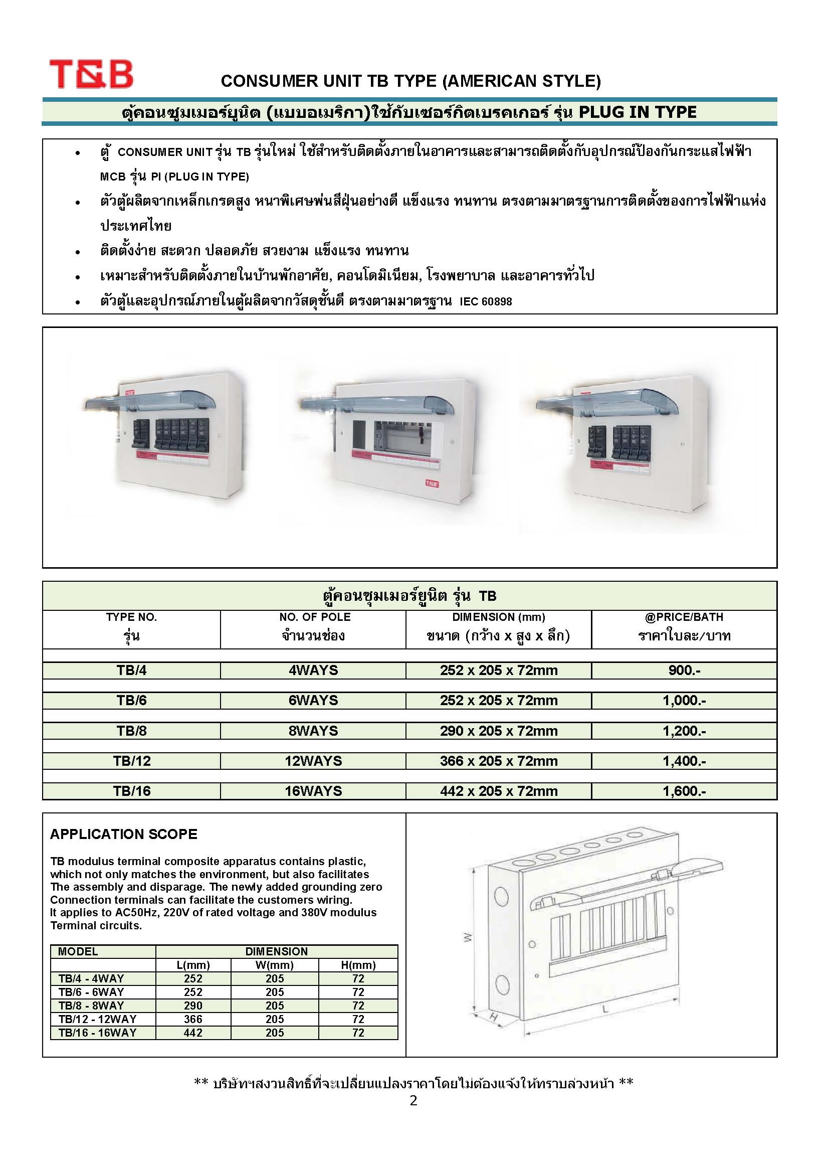 ตู้ consumer unit รุ่น TB รุ่นใหม่ ใช้สำหรับติดตั้งภายในอาคารและสามารถติดตั้งกับอุปกรณ์ป้องกันกระแสไฟฟ้า MCB รุ่น PI (PLUG IN TYPE)
